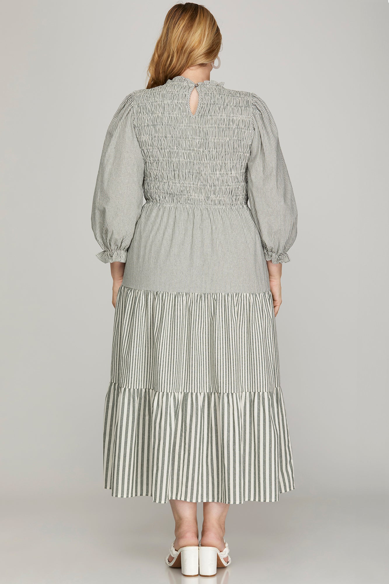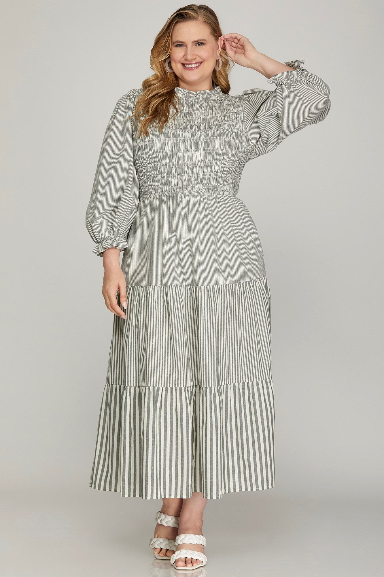 Experience effortless elegance with our Charlotte Middi Dress. Featuring 3/4 sleeves and a smocked top, this olive green midi dress flatters and supports in all the right places. The tiered design adds a touch of luxury, while the convenient pockets make it practical for any occasion. This plus size dress is a must-have for the fashion-forward woman.