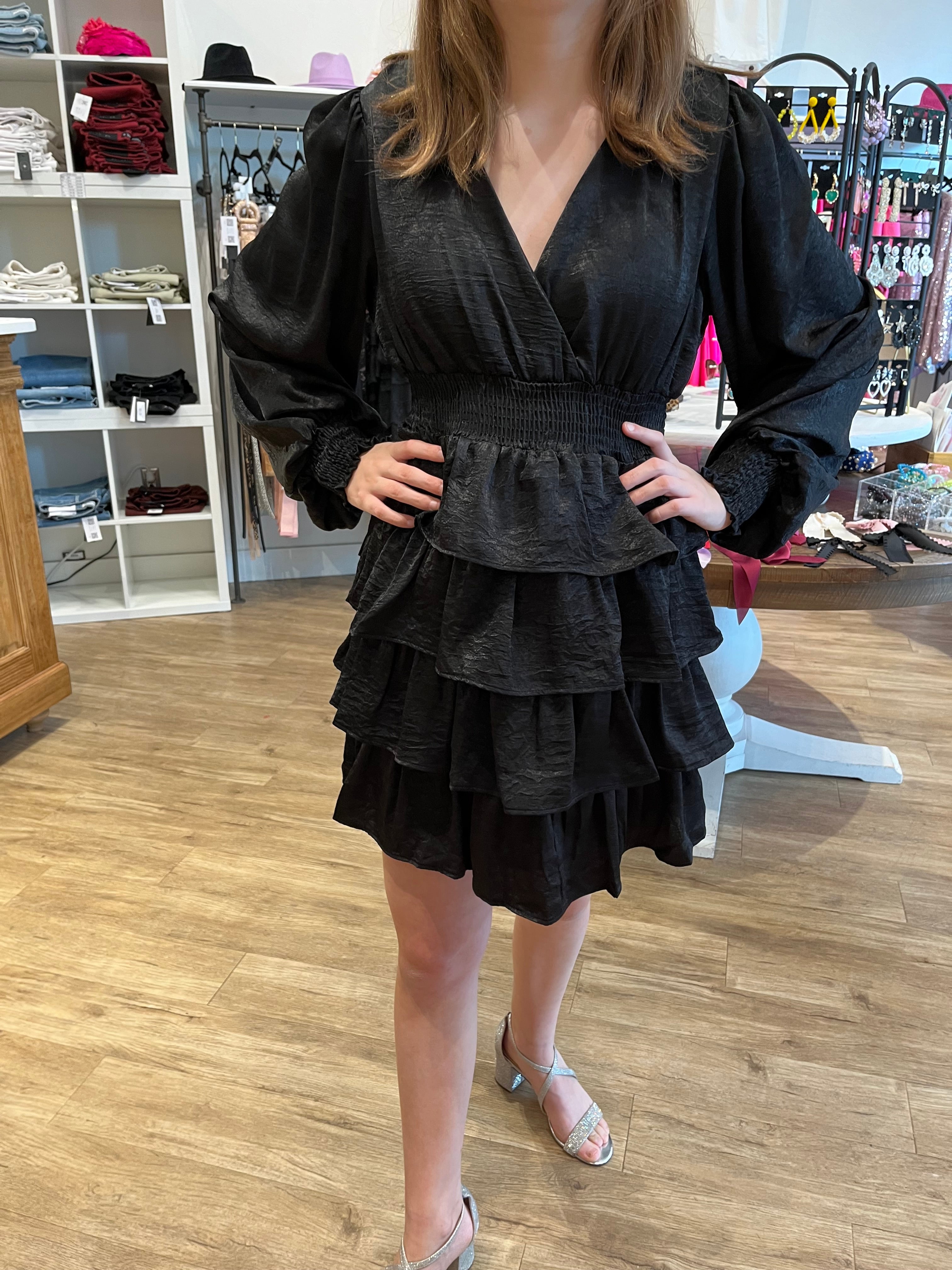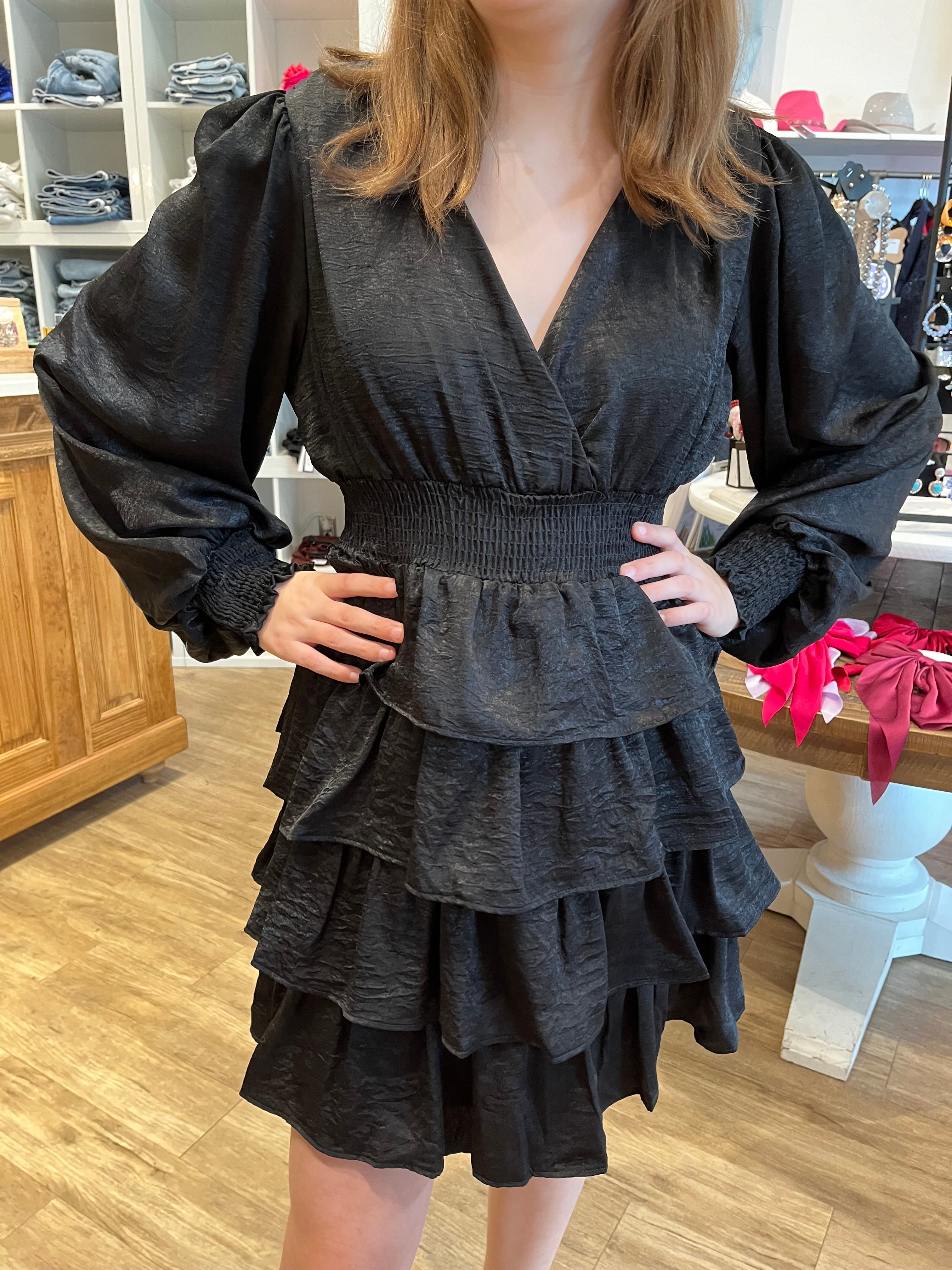 Elevate your style with our Emma Black Satin Dress. This luxurious knee-length dress features a lined silhouette and elegant ruffles, crafted from high-quality satin fabric. With long-sleeves and a flattering v-neck cut, this dress is perfect for any event. Make a statement and stand out in sophistication.