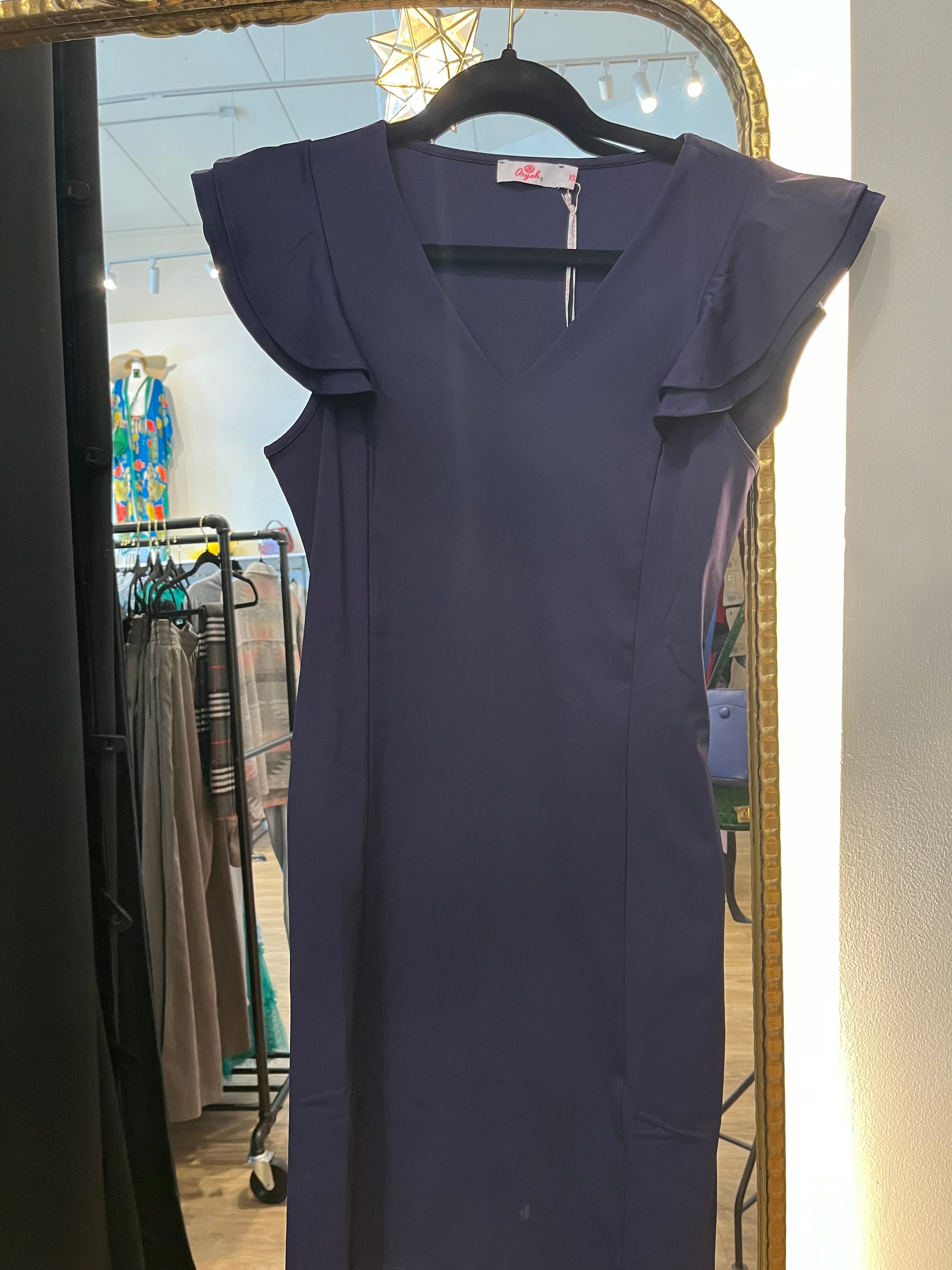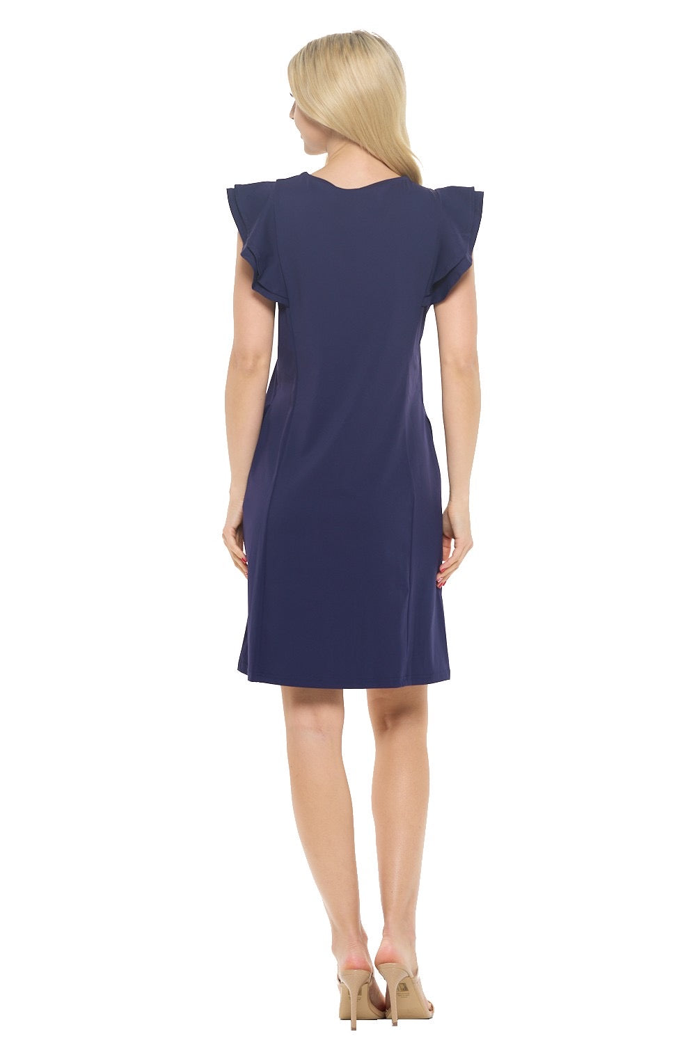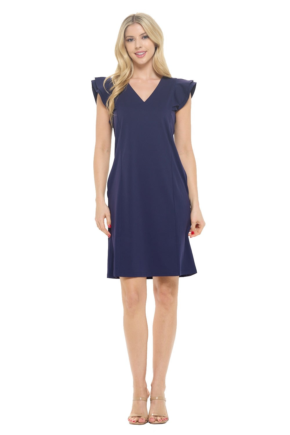Effortlessly elegant, this Pleated Cap Sleeve Dress in Solid Navy will elevate your outdoor style. Crafted with a Navy hue and short ruffle sleeves, it features a V neck and pockets for convenience. The unique fabric feels like swimsuit material, making it perfect for activities like tennis, golf, boating, and beach days.