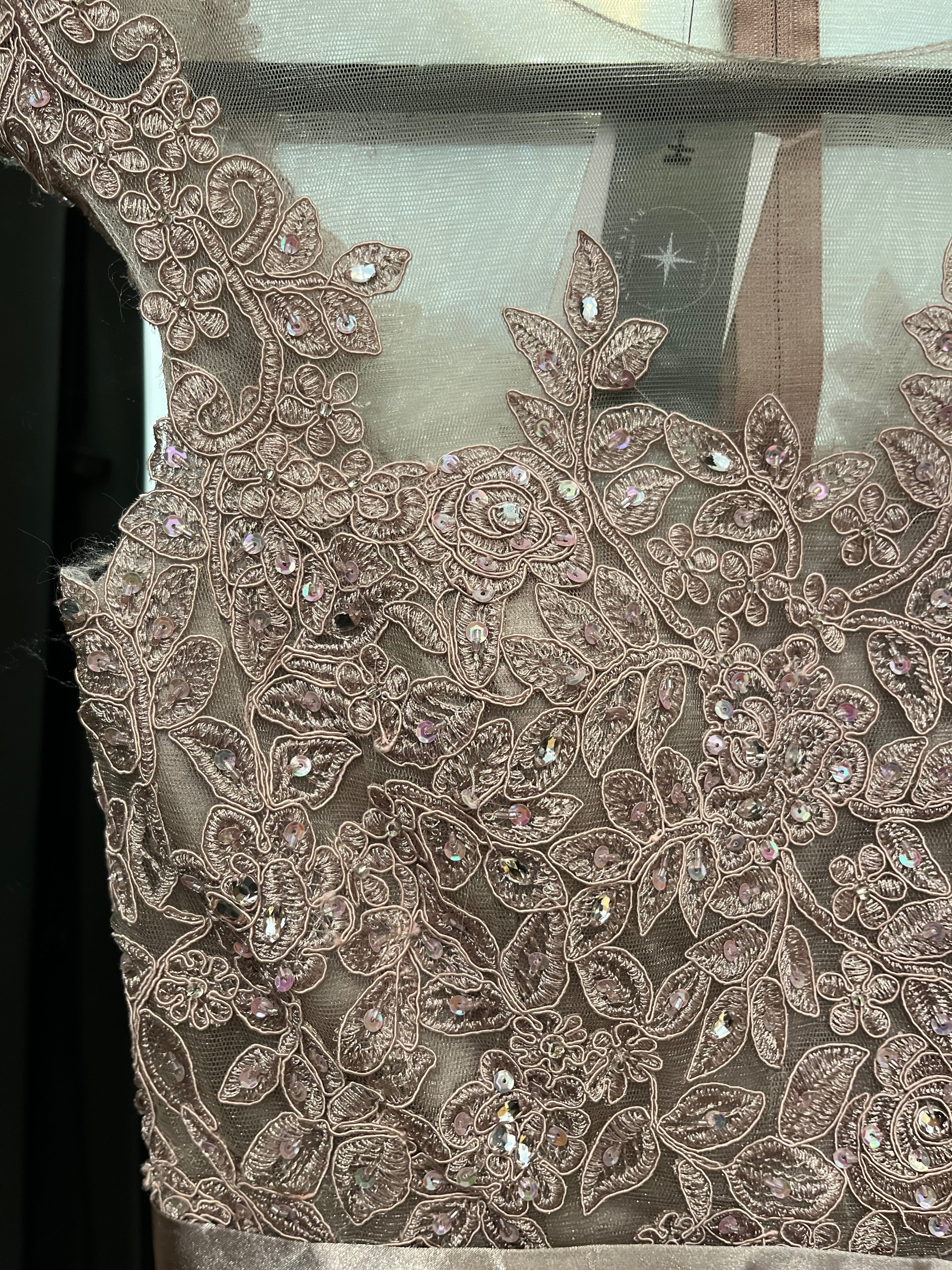 Indulge in luxury with the Avery Formal Dress. Crafted in a stunning mocha hue, this knee-length dress boasts delicate details on the top and comes with a shawl for added elegance. Designed for modesty, it includes bra padding for comfort and covers the shoulders. Make a statement at your next formal event with this exquisite dress!