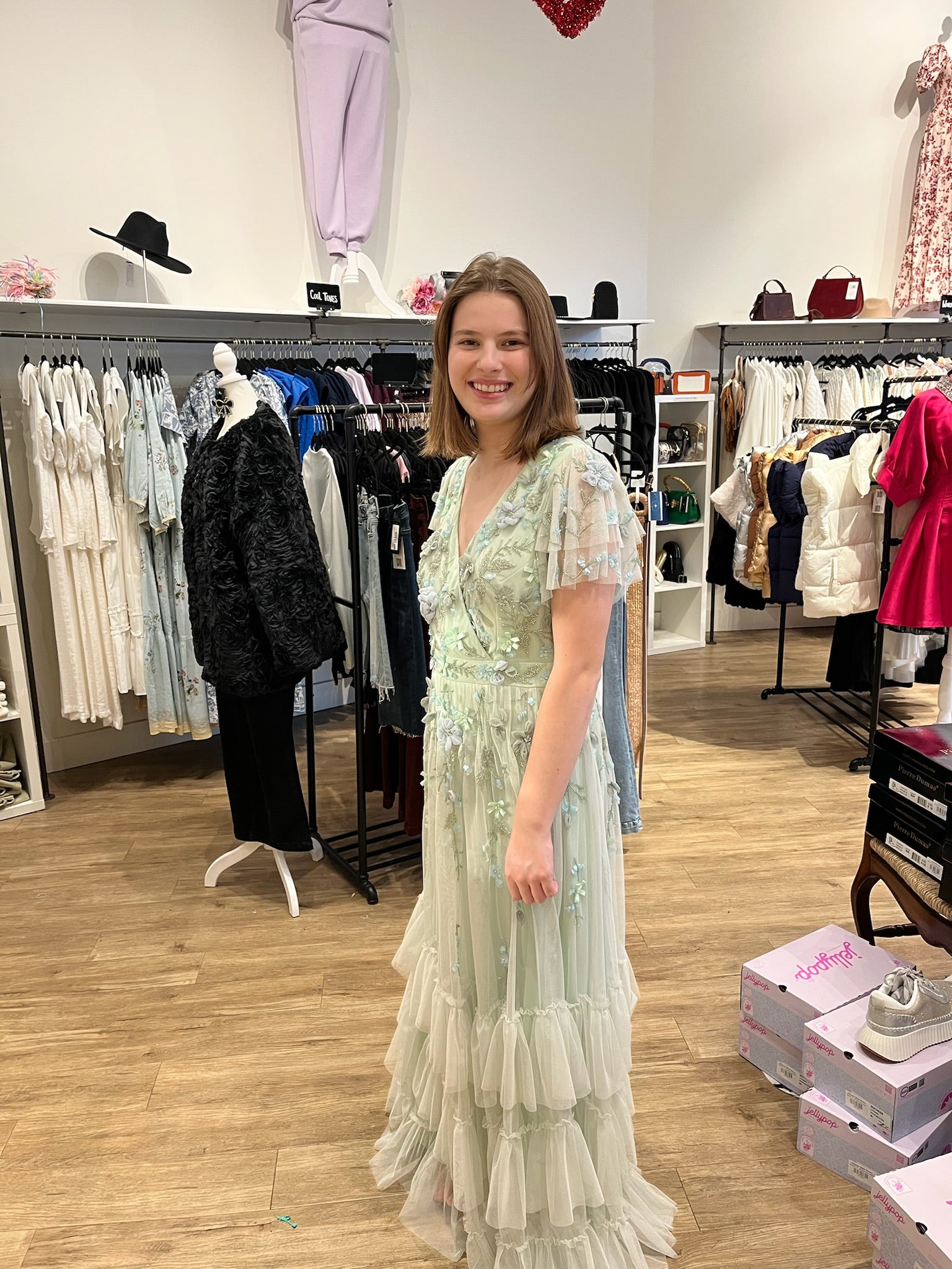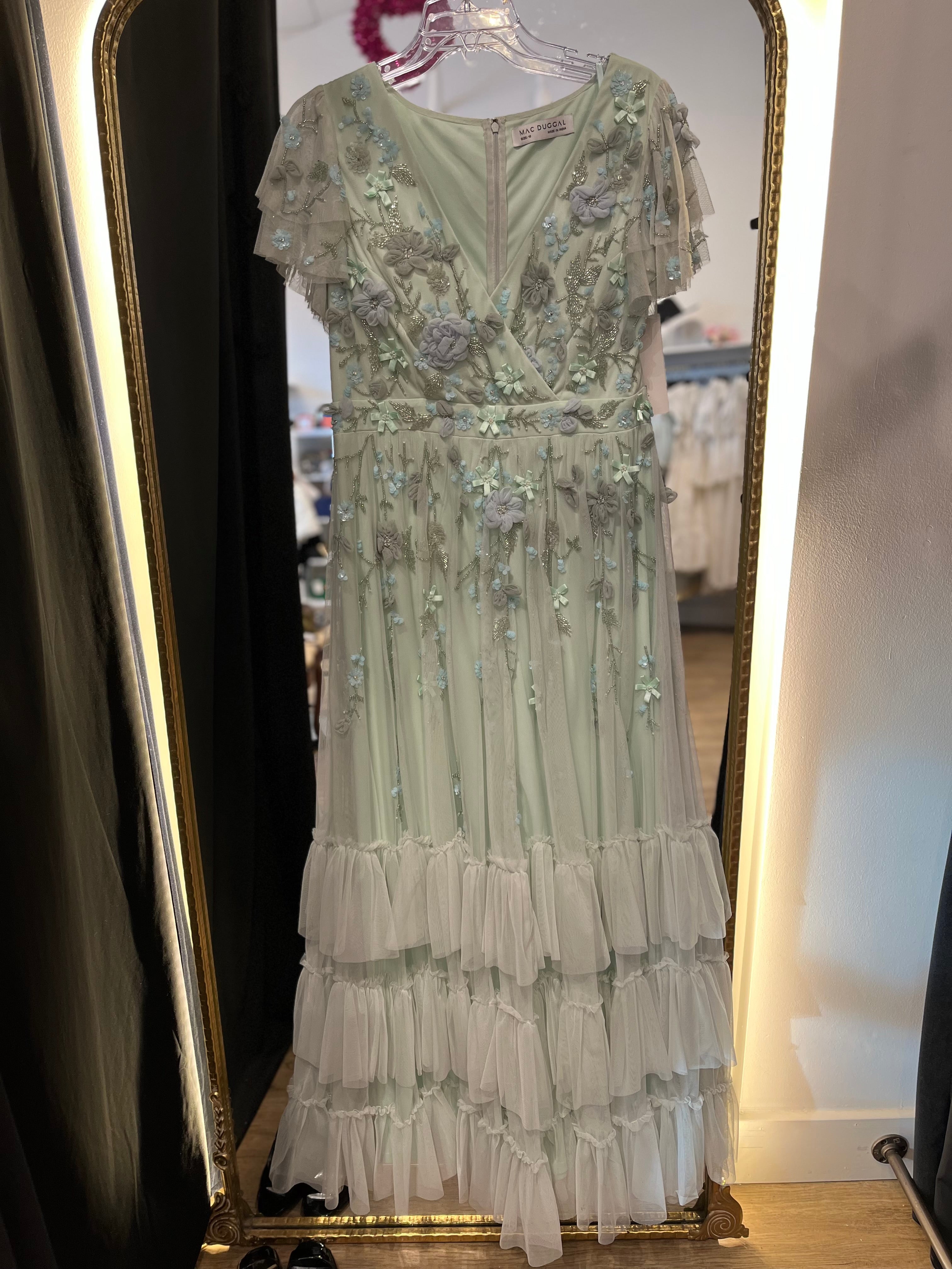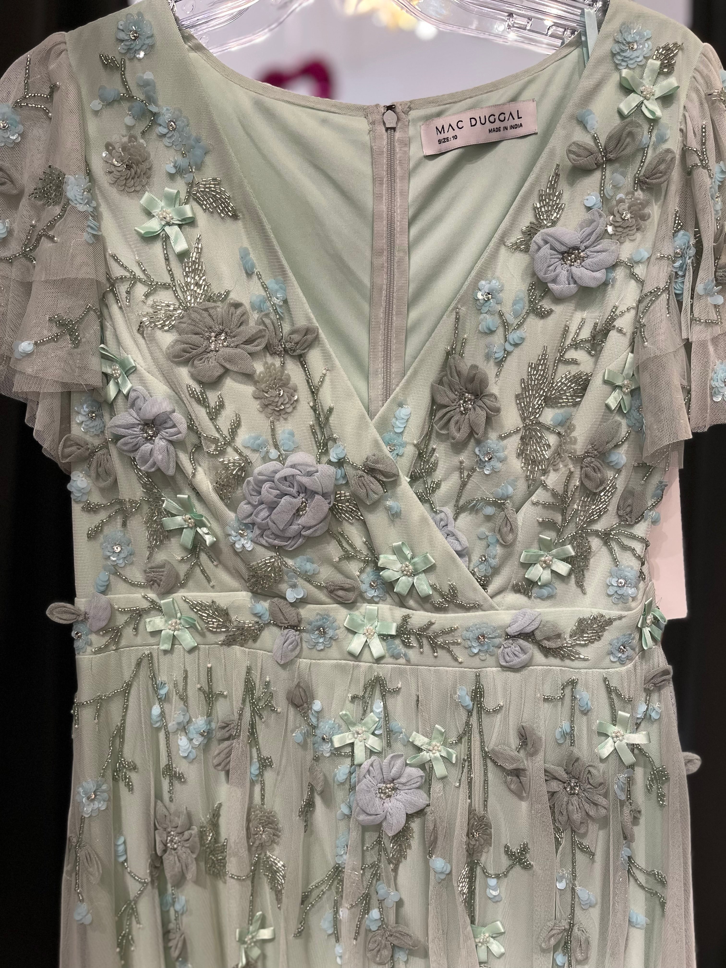 Indulge in luxury with the Julia Seafoam Formal Dress. The partially lined bodice and fully lined skirt provide a sophisticated silhouette, while the sheer unlined sleeves add a touch of sensuality. The illusion neckline and short cap sleeves create an elegant look, while the hand-stitched rhinestone and sequin embellishments add a touch of glamour. The ruffle tiered skirt and concealed back zipper complete the exclusive and refined design.